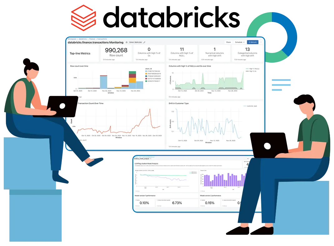 Our team builds Delta Live Tables (DLT) pipelines, PySpark & SQL data pipelines, and analytics layers powered by Databricks SQL / Databricks SQL endpoints and Databricks SQL Dashboards and Visualizations. We also set up Feature Store Definition and Implementation and MLflow MLOps / MLflow model registry to support your AI roadmap.